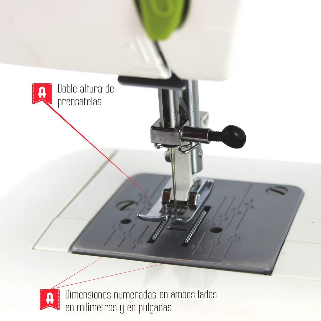 Incluye doble altura de prensatelas ideal para coser géneros gruesos como los vaqueros o el cuero.